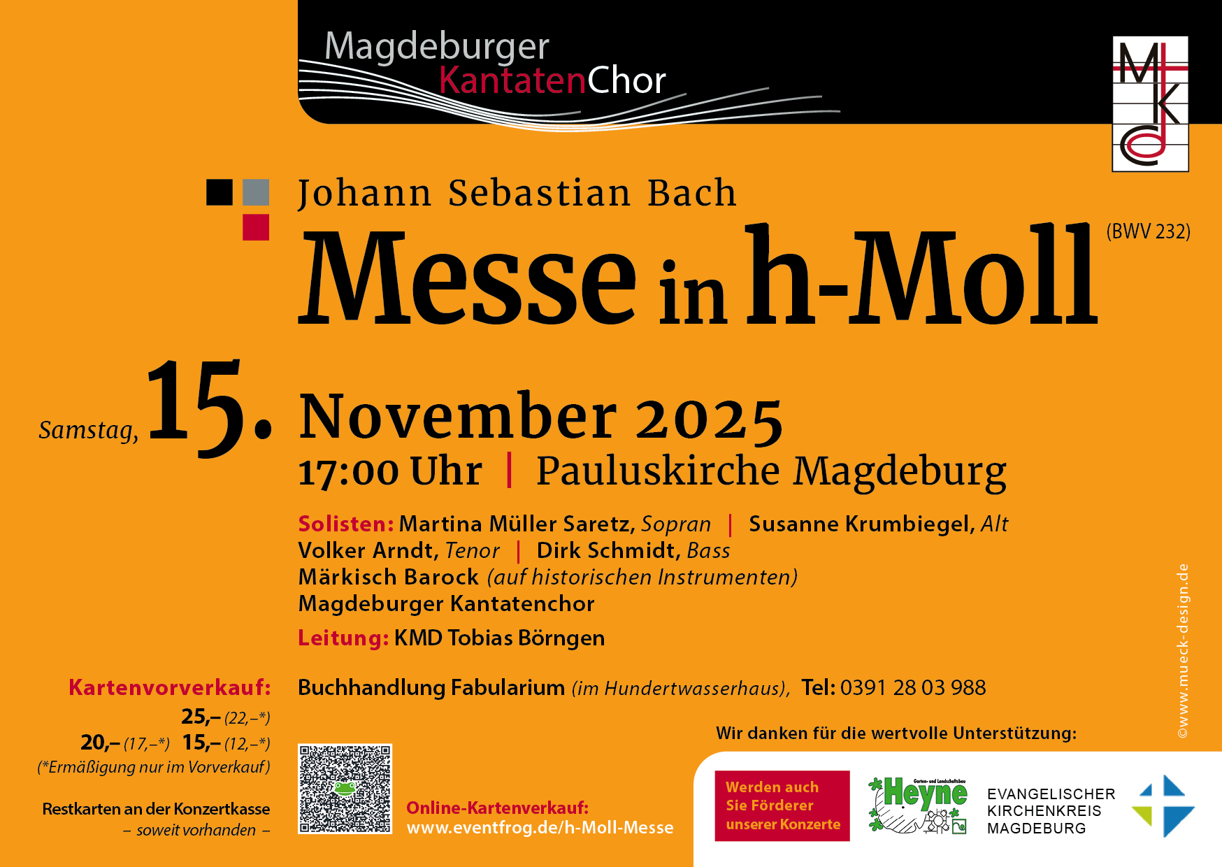 Am Samstag, 15. November, ist um 17:00 Uhr mit der „Hohen Messe in h-Moll“ von Johann Sebastian Bach ein musikalisches Großereignis, wie es in Magdeburg nur selten stattfindet, in der Pauluskirche zu erleben! Um 17:00 Uhr beginnt die Aufführung des Magdeburger Kantatenchores sowie äußerst namhafter Solisten, die von Märkisch Barock, einem Spezialensemble für Alte Musik, unter Leitung von Tobias Börngen begleitet werden.